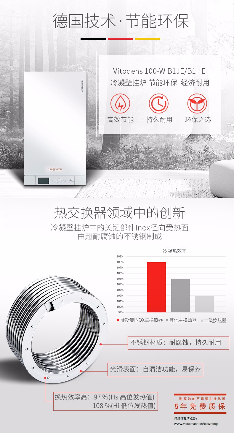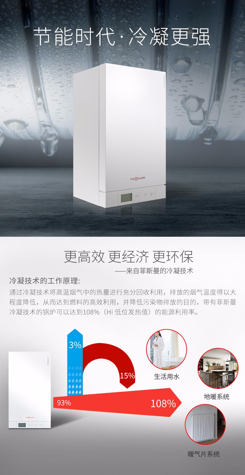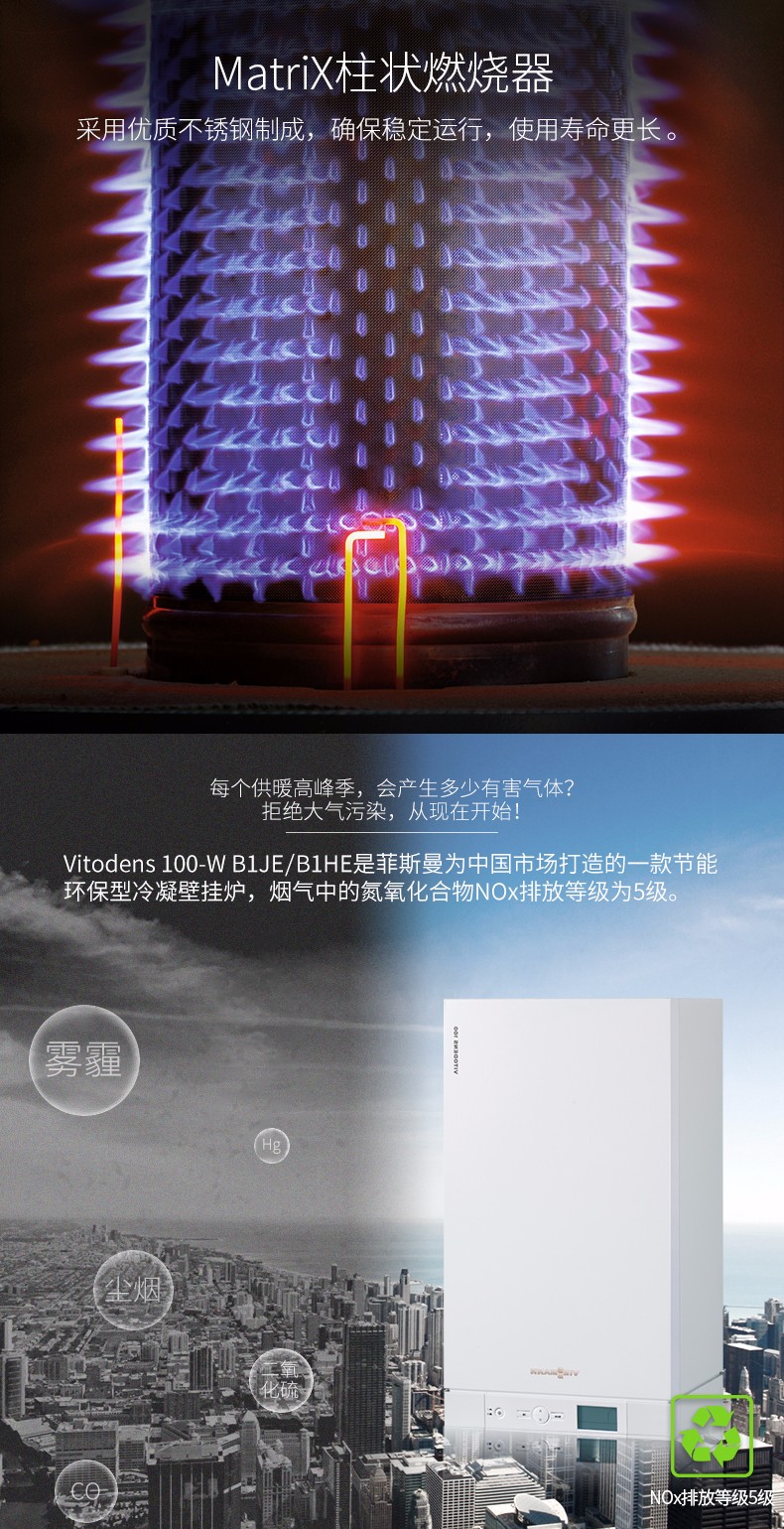 您在追求一種時(shí)尚環(huán)保的生活方式,尋找一款環(huán)保性能******的供暖設(shè)備嗎?那么,請把這個(gè)任務(wù)交給菲斯曼吧。作為行業(yè)中的領(lǐng)軍品牌,菲斯曼一直非常重視社會(huì)責(zé)任與環(huán)保責(zé)任的并行發(fā)展。因此,冷凝技術(shù)發(fā)展在菲斯曼得到非常大的重視與利用。2001 年,菲斯曼自主研發(fā)的冷凝換熱器不銹鋼Inox 徑向換熱器問世,應(yīng)用至今,以其高效環(huán)保、經(jīng)久耐用及易維護(hù)保養(yǎng)的諸多優(yōu)勢站穩(wěn)了其在全球市場中的領(lǐng)導(dǎo)地位。Vitodens 100- W B1JE/B1HE 是菲斯曼專為中國市場打造的一款節(jié)能環(huán)保型冷凝壁掛爐產(chǎn)品,對比非冷凝產(chǎn)品,在提高使用效率的同時(shí),煙氣中的NOx 的排放大大降低,從而為環(huán)保做出了貢獻(xiàn)。
